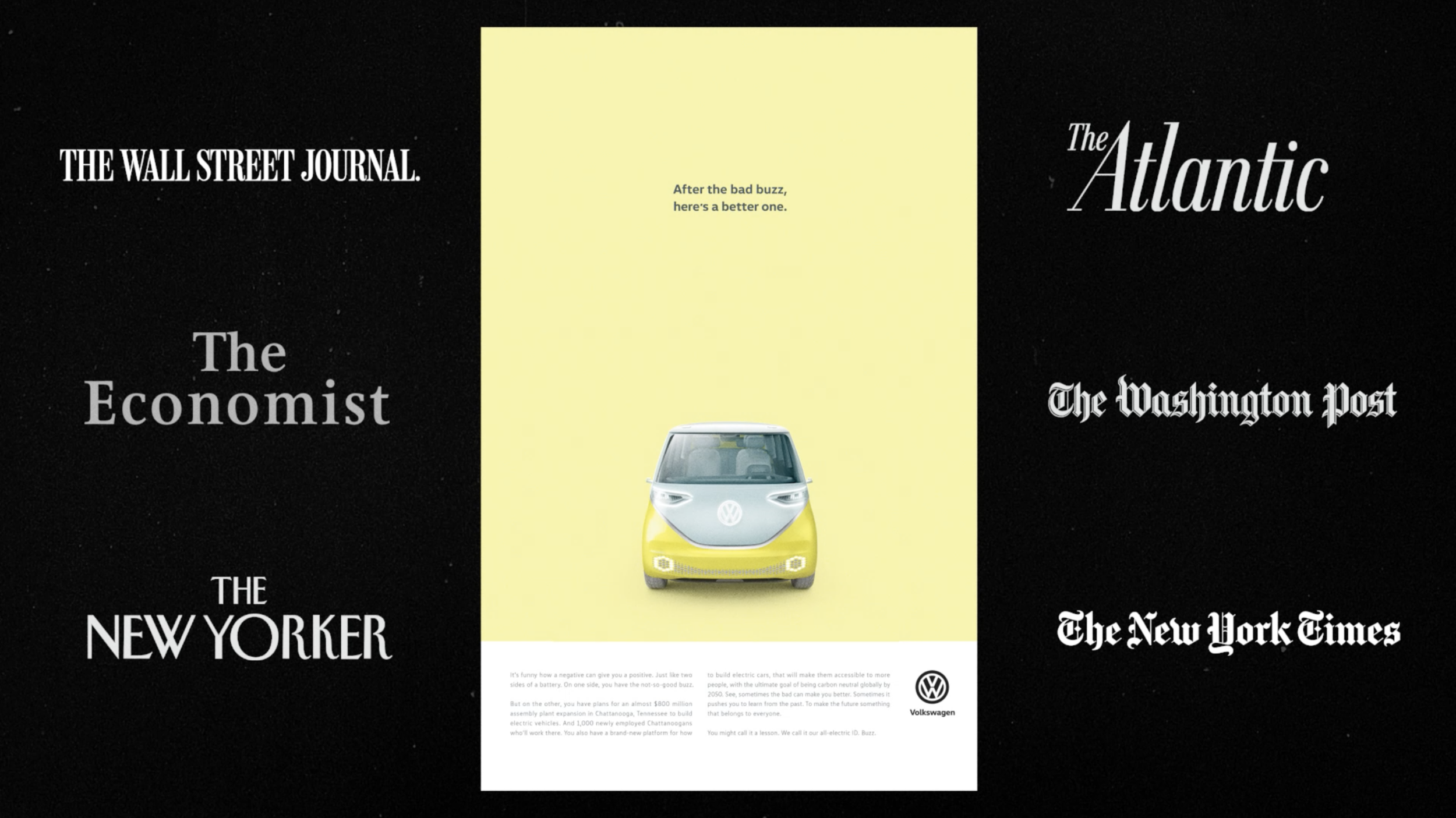 We chose to address the matter head on with a piece of work unlike any other in the auto category, We worked on a bold series of print ads: Including “After the Bad Buzz, Here is A Better One,” that embraces the brand’s hallmark wit and “Lemonade,” a homage to the brand’s iconic “Lemon” print ad from the 1960s.